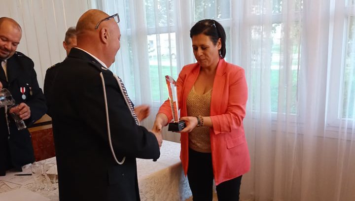 Ta wreszcie nadarzyła się w ostatni weekend września. W niedzielne popołudnie, podczas walnego zebrania sprawozdawczo-wyborczego OSP Chorzele, zwieńczyliśmy wreszcie cały proces. W imieniu TPCh statuetkę przekazała Aleksandra Wiśnicka.