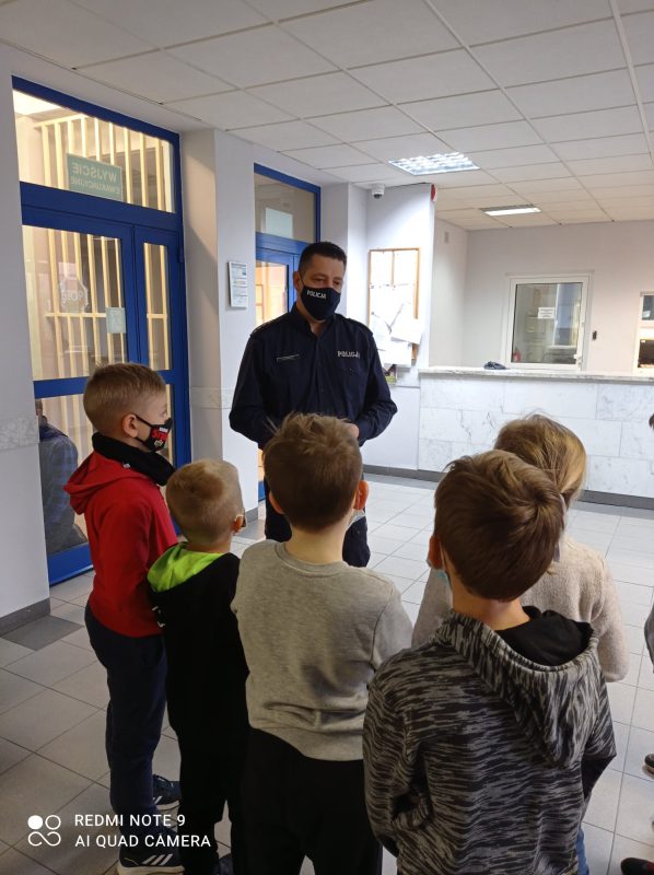 Pierwszym punktem wyjazdu była Komenda Powiatowa Policji w Przasnyszu. Podczas spotkania policjanci pokazali, jak wygląda ich codzienna służba, kto odbiera telefony gdy wykręcamy numery alarmowe – 112. Podczas wycieczki dzieci zapoznały się z pracą policji na różnych wydziałach. Atrakcją było obejrzenie części budynku, gdzie są cele oraz otrzymanie pamiątkowego odcisku palca. Uczniowie wysłuchali podstawowych zasad bezpieczeństwa podczas pokonywania codziennej drogi do szkoły, zobaczyły z bliska radiowozy.