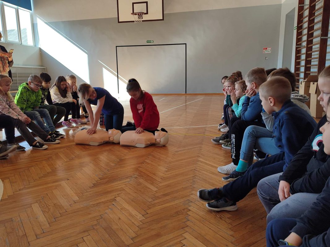 Zajęcia poprowadziła mama jednego z uczniów, pani dr Dominika Olkowska. Dzieci z zainteresowaniem obserwowały, a następnie samodzielnie ćwiczyły udzielania pierwszej pomocy na fantomach.