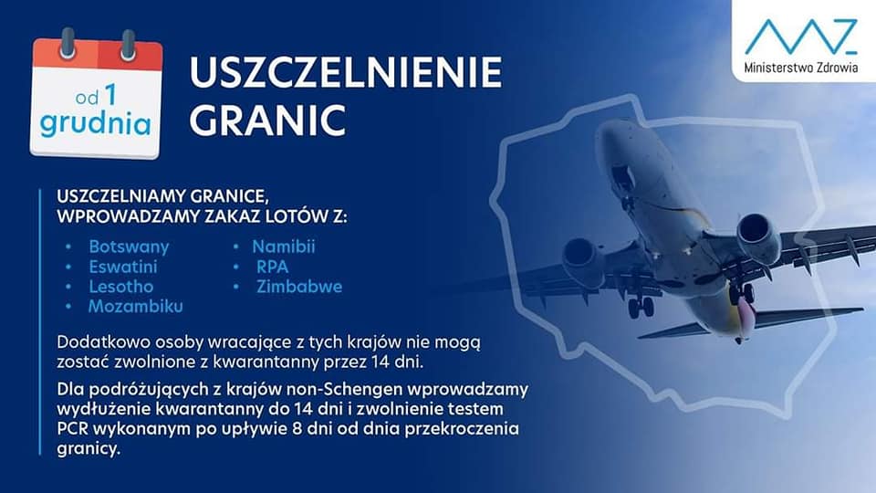 Adam Niedzielski podczas konferencji zauważył, że IV fala zakażeń koronawirusem zaczęła się już zmniejszać, jednak wszystko może pokrzyżować nowa odmiana Covid-19. Spowodowało to, że rząd przygotował pakiet alertowy obostrzeń. Pozwoli on na ocenienie nowej sytuacji epidemiologicznej w kraju. Wśród obostrzeń znalazł się zakaz lotów do siedmiu, afrykańskich krajów, czyli Bostwany, Eswatini, Lesotho, Mozambiku, Nambii, RPA oraz Zimbabwe.