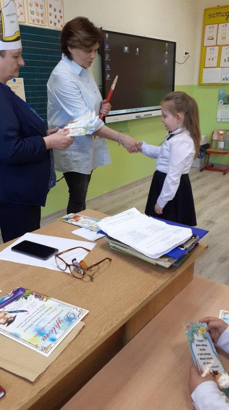 Poznali również prośby książki, pracę nauczyciela – bibliotekarza oraz regulamin biblioteki szkolnej. Dzieci po uroczystym przyrzeczeniu zostały pasowane przez panią dyrektor Małgorzatę Budną na czytelników. Otrzymały pamiątkowe dyplomy oraz kolorowe zakładki. Uwieńczeniem zajęć było wypożyczenie przez uczniów swojej pierwszej książki.