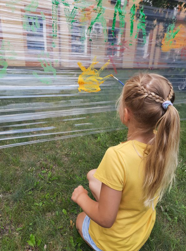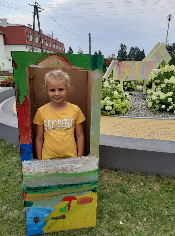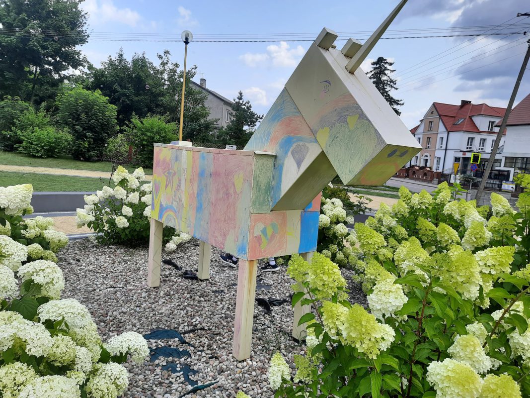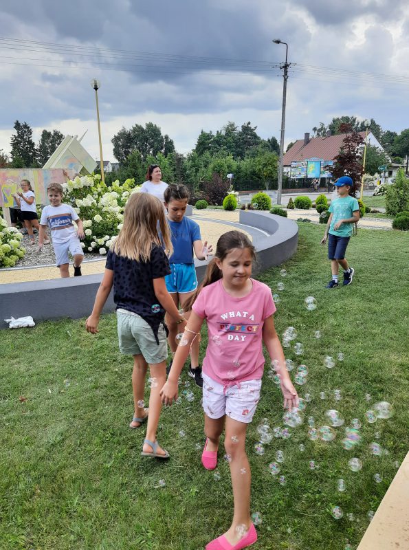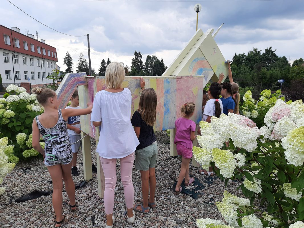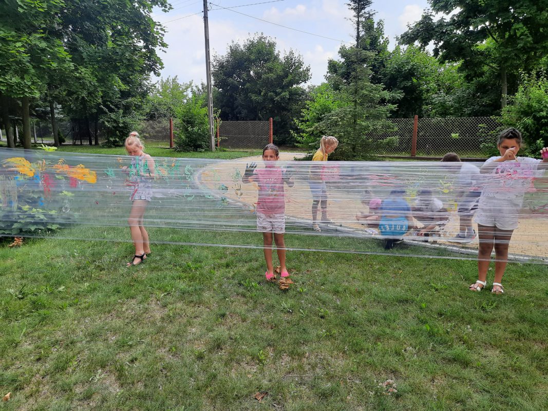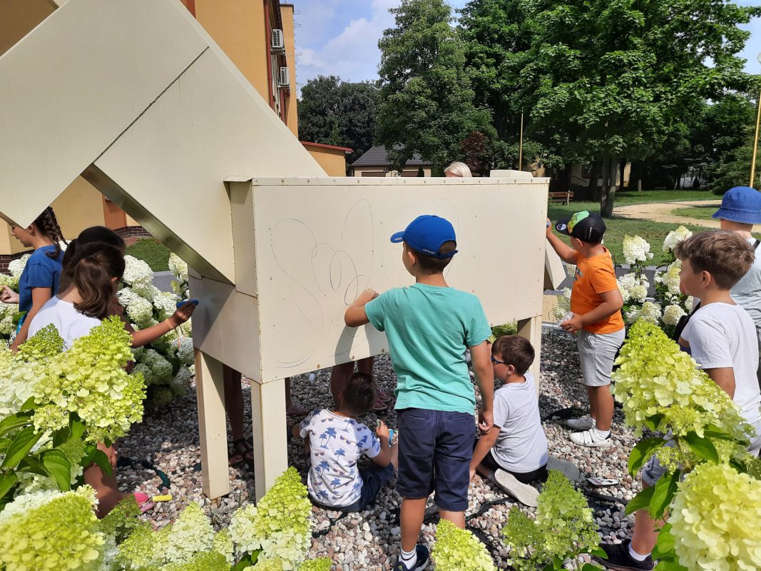 Ostatniego dnia „Wakacji z Biblioteką” daliśmy upust swoim talentom artystycznym oraz wodzom fantazji. Żółty, metalowy a czasami też określany jako Minecraftowy jednorożec nabrał koloru. Na zakończenie „Wakacji z Biblioteką” udało nam się uzyskać zgodę na jednorazowe pomalowanie kredą jednorożca. Dziękujemy za tą możliwość. Ponad to zrobiliśmy sobie Fotobudkę, malowaliśmy na folii oraz goniliśmy bańki mydlane.