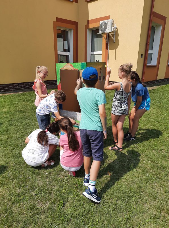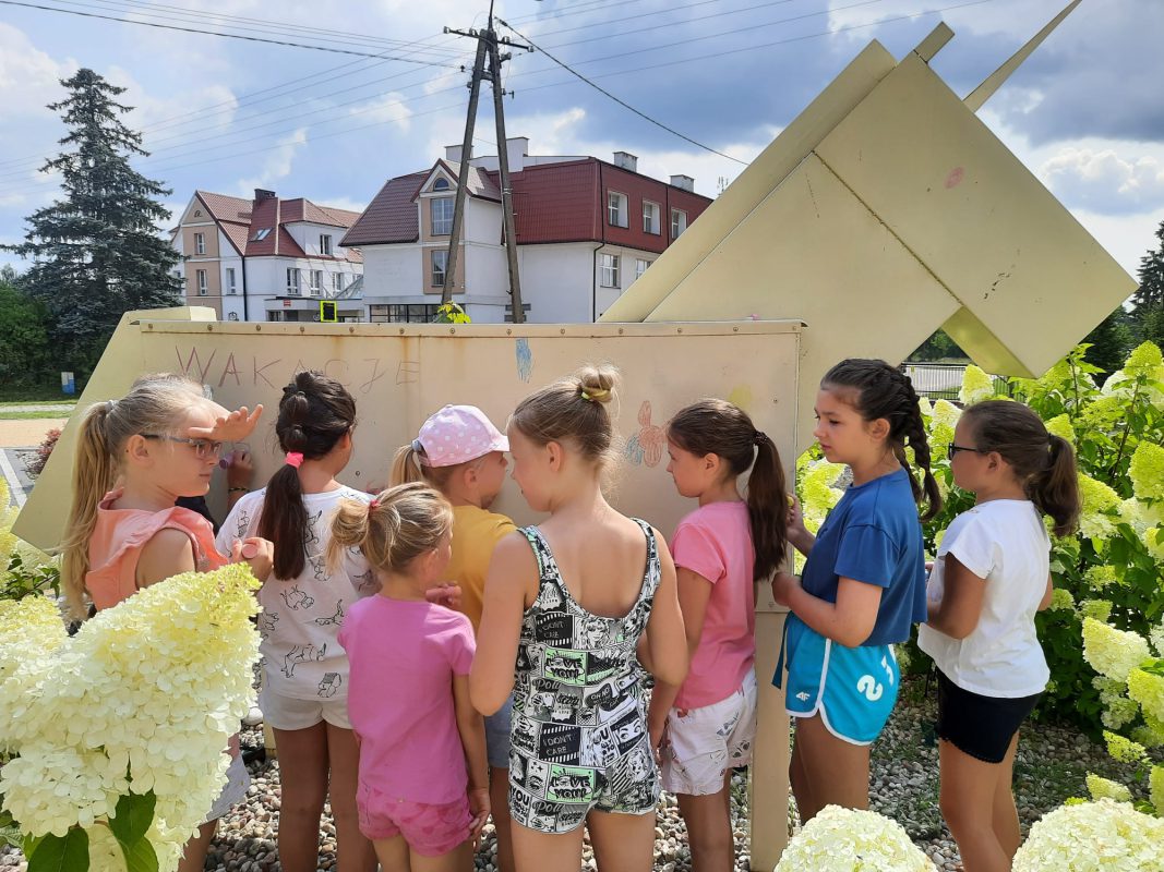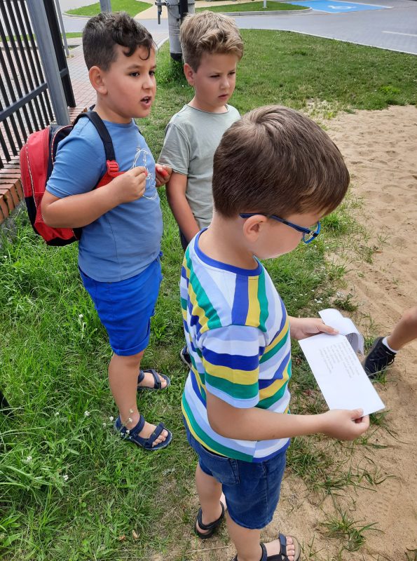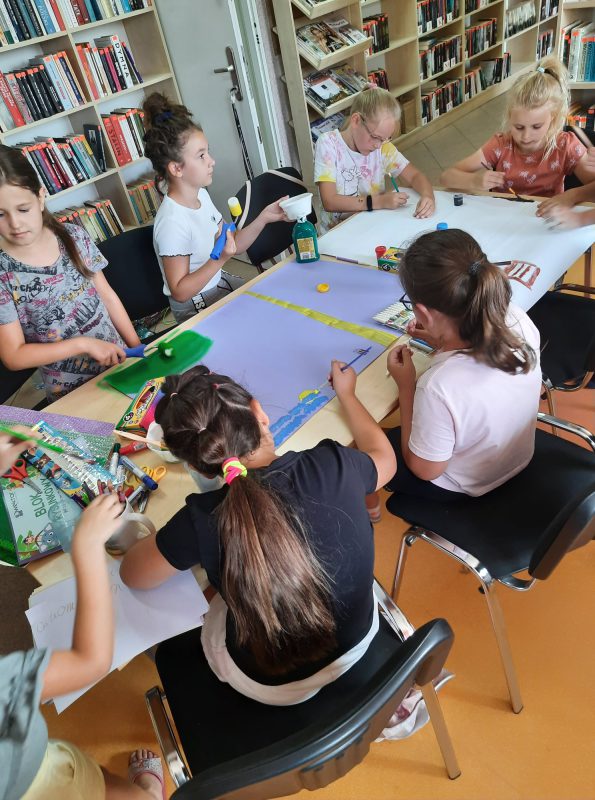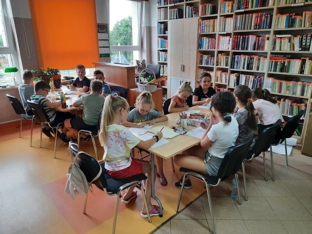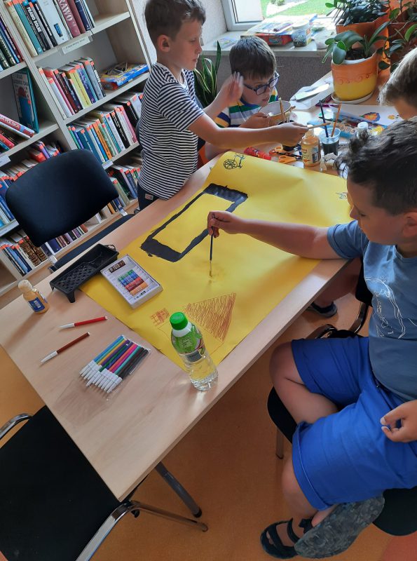 Dzieci podzieliły się na 2 drużyny. Każda drużyna dostała pakiet zagadek ze wskazówkami, gdzie znajduje się wcześniej wygenerowany kod QR przekierowujący do strony atrakcji – miejsca, które podczas tygodnia „Wakacji z Biblioteką” odwiedzimy. Następnie drużyny zobrazowały zdobytą podczas podchodów wiedzę, robiąc plakaty informujące o „Wakacjach z biblioteką”.