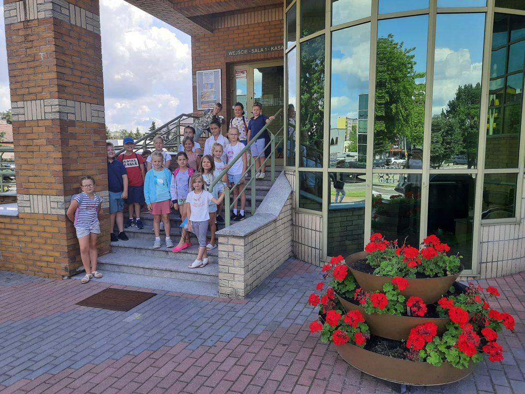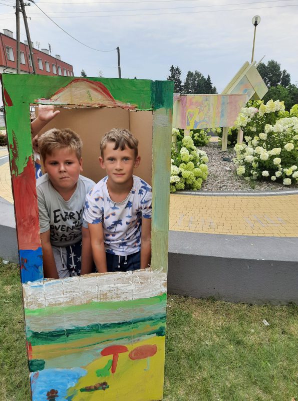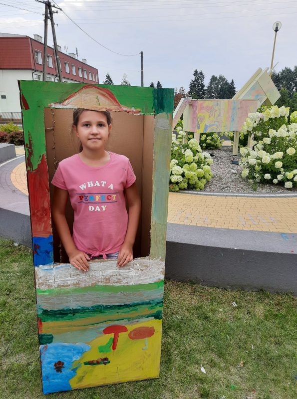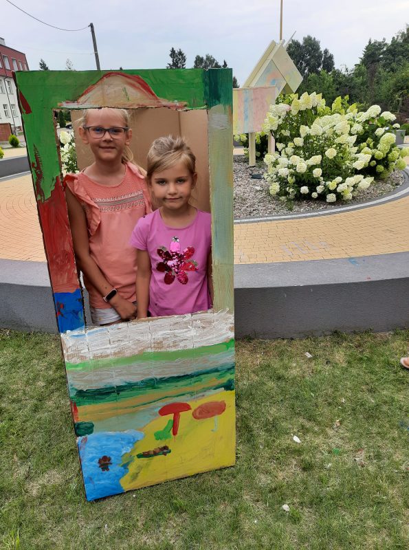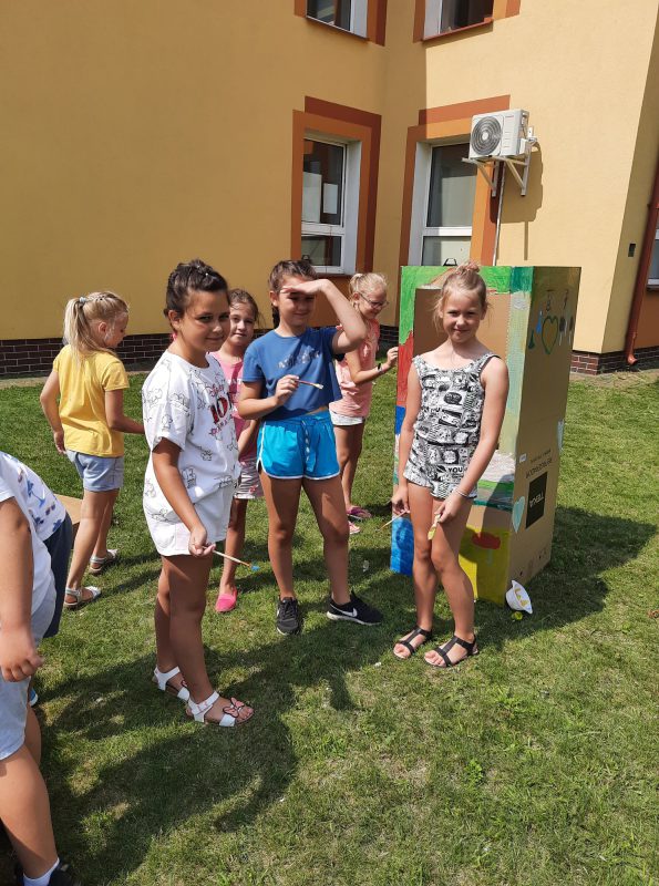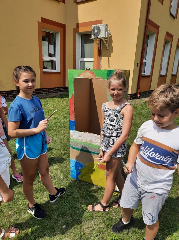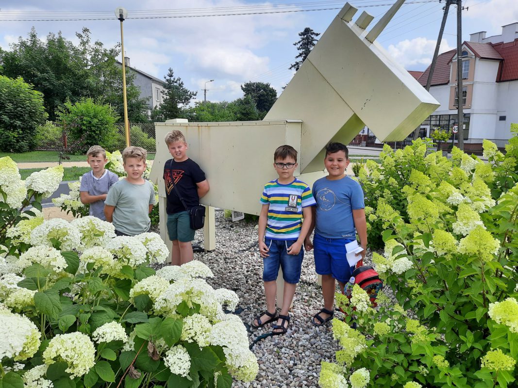 Dzieci podzieliły się na 2 drużyny. Każda drużyna dostała pakiet zagadek ze wskazówkami, gdzie znajduje się wcześniej wygenerowany kod QR przekierowujący do strony atrakcji – miejsca, które podczas tygodnia „Wakacji z Biblioteką” odwiedzimy. Następnie drużyny zobrazowały zdobytą podczas podchodów wiedzę, robiąc plakaty informujące o „Wakacjach z biblioteką”.