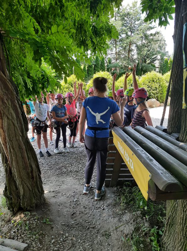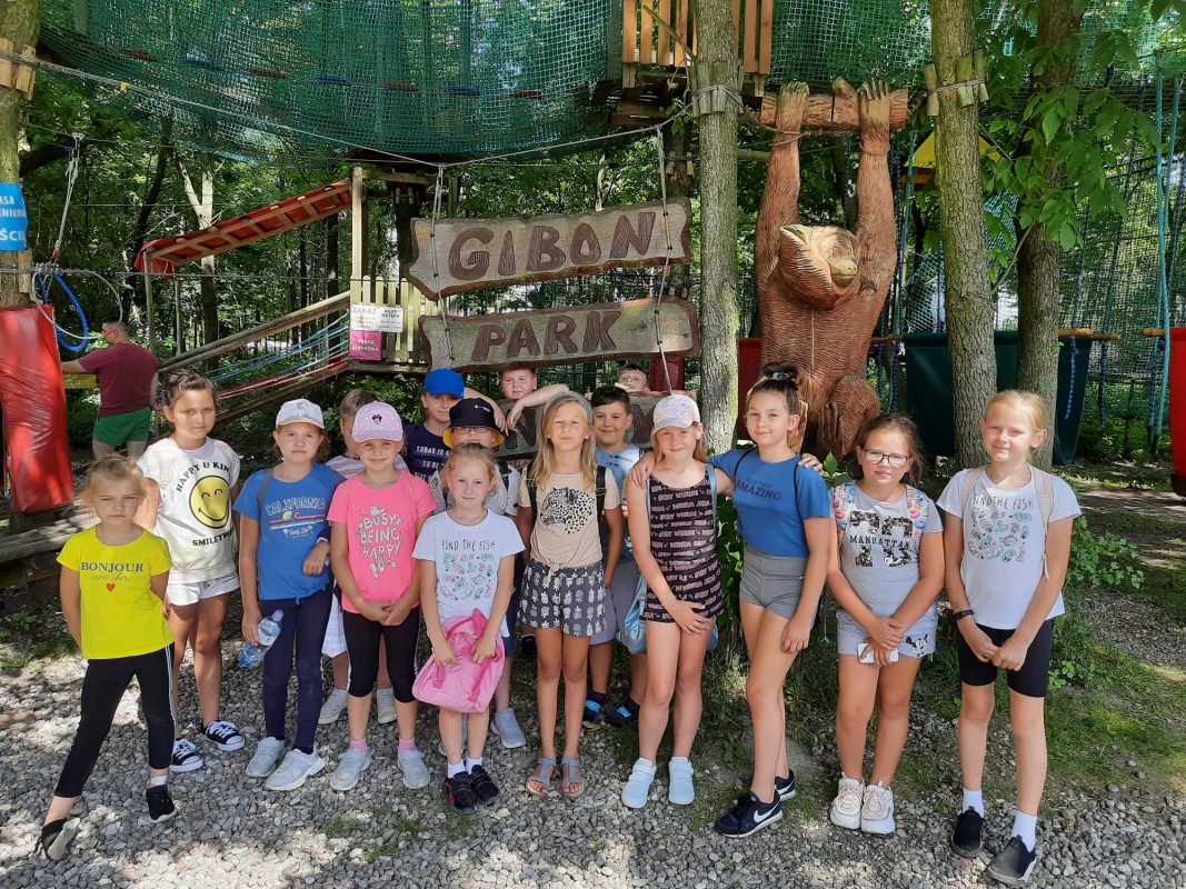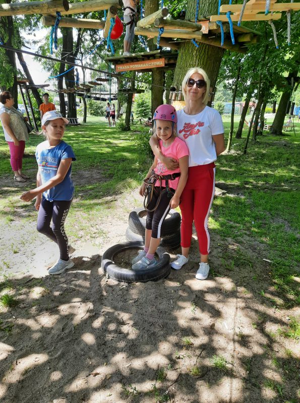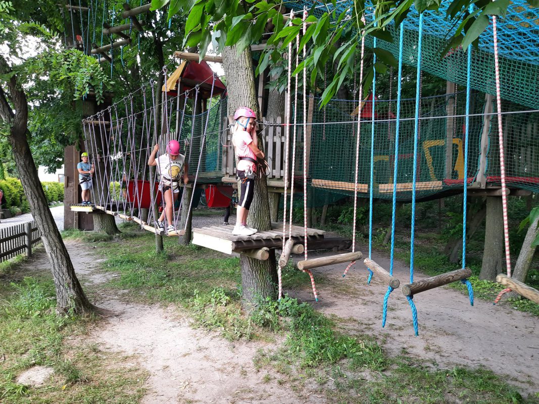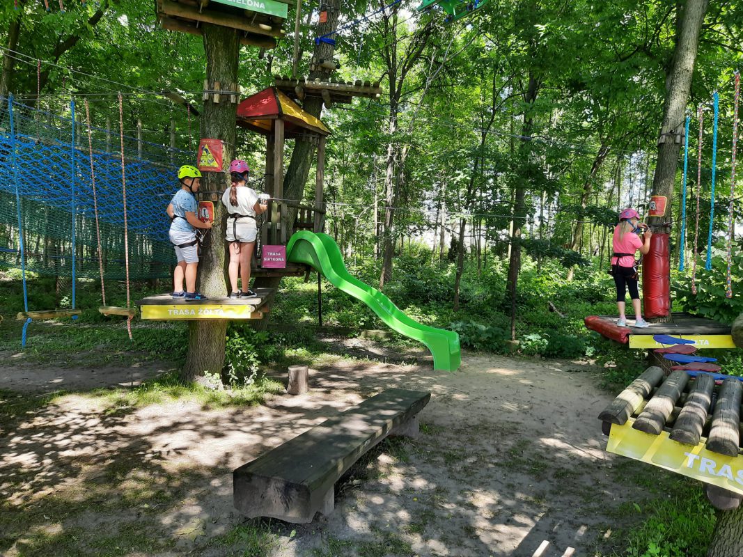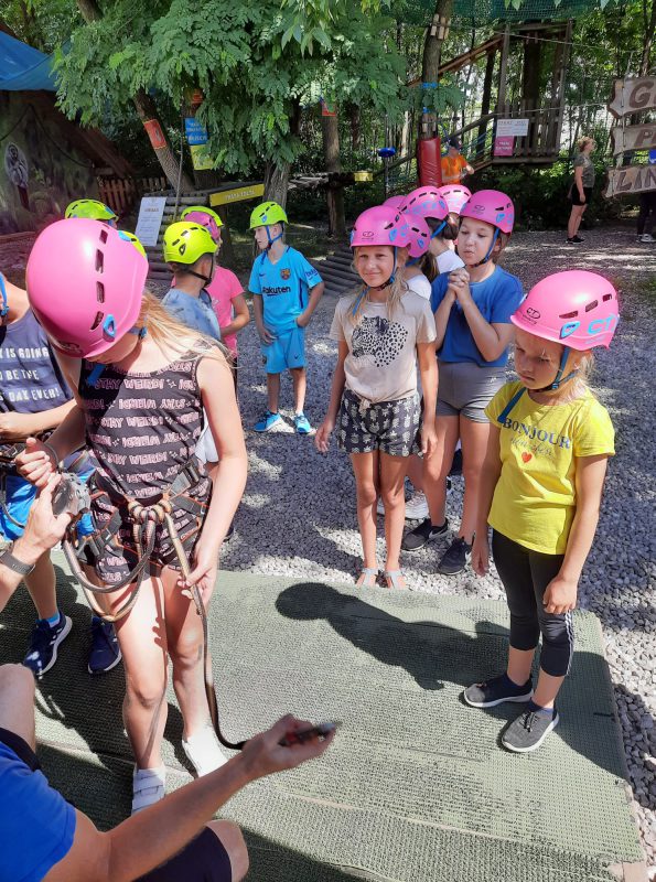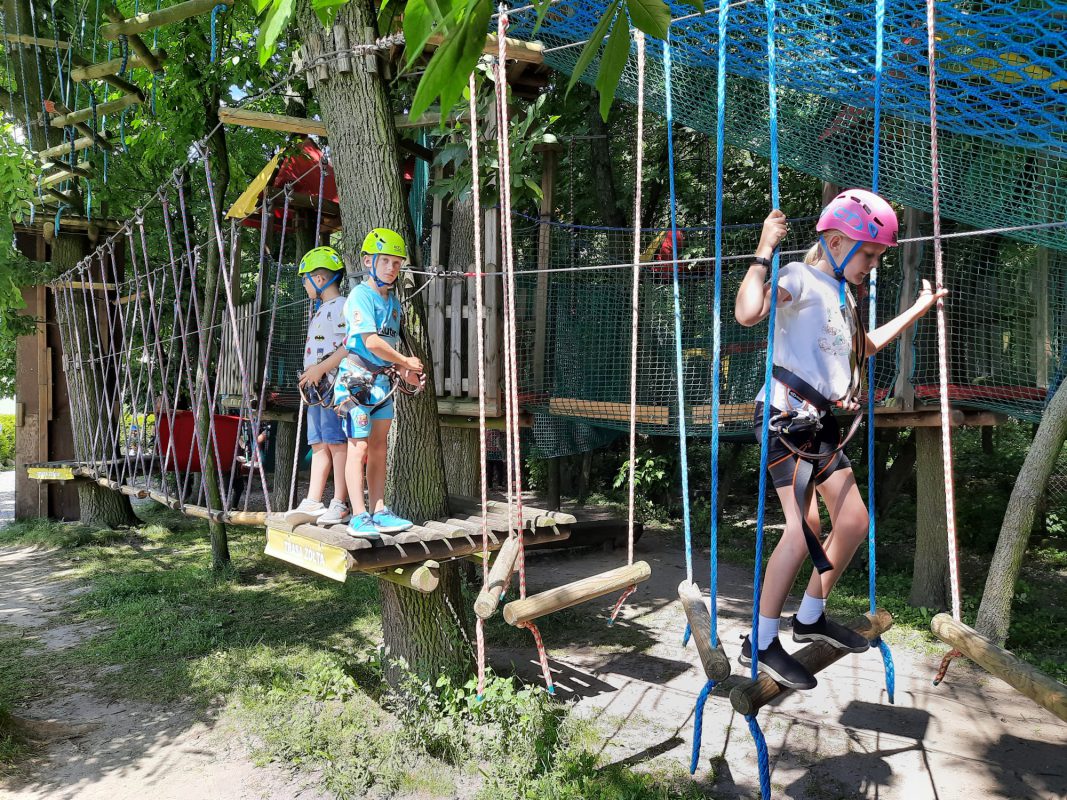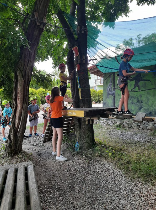 Drugiego dnia pojechaliśmy do Parku Linowego „Gibon” w Przasnyszu, gdzie po przeszkoleniu przez pracowników parku, każde dziecko miało okazję zmierzyć się z 2 trasami – żółtą oraz pomarańczową.