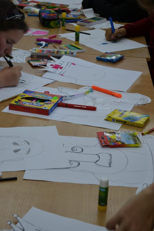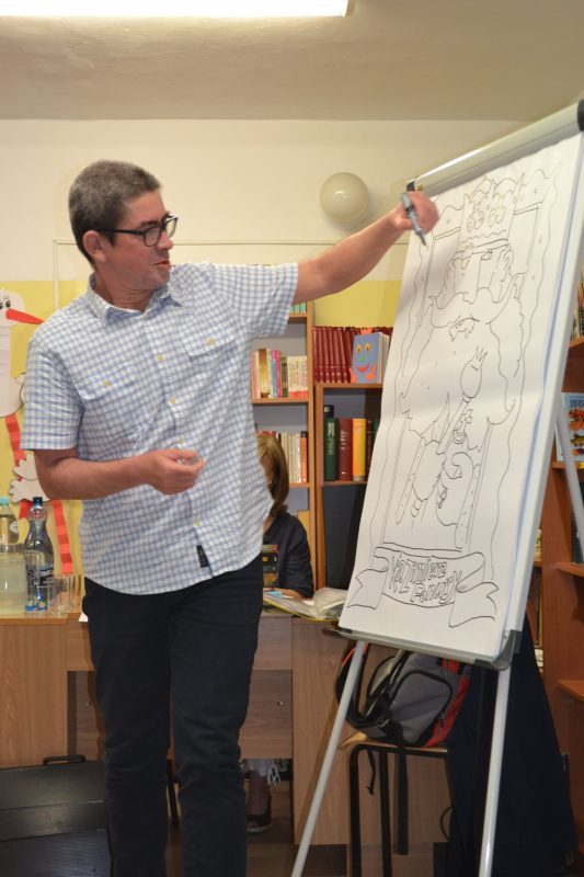 W dalszej części spotkania odbyły się warsztaty z ilustracji. Uczniowie próbowali swoich sił w tworzeniu portretu wymyślonych przez siebie królów. Pomysły zaskoczyły nawet samego ilustratora. Nie mogło także zabraknąć pokazu kunsztu ilustracji w wykonaniu gościa.