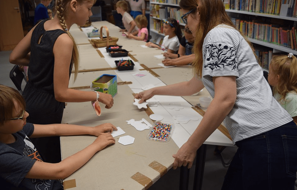 Zakończył się pierwszy tydzień wakacji z biblioteką. W ubiegły piątek dzieci wzięły udział w warsztatach z koralikami HAMA. Przy użyciu wielobarwnych koralików dzieci wyczarowały piękne i niepowtarzalne obrazki, które dzieci na pamiątkę zabrały do domu.