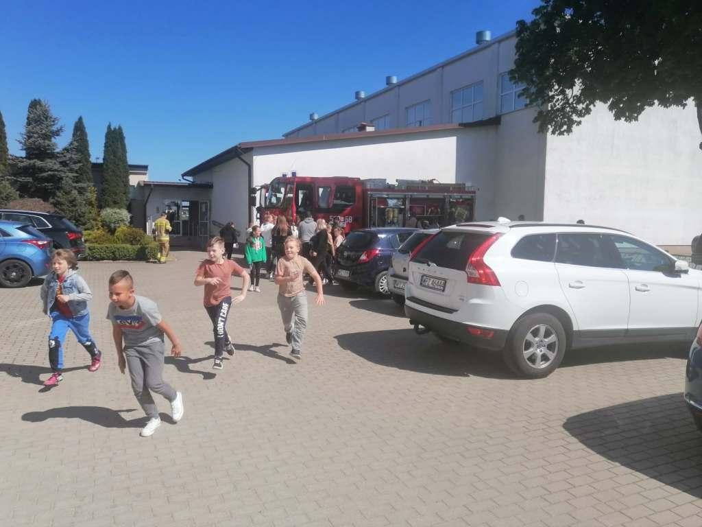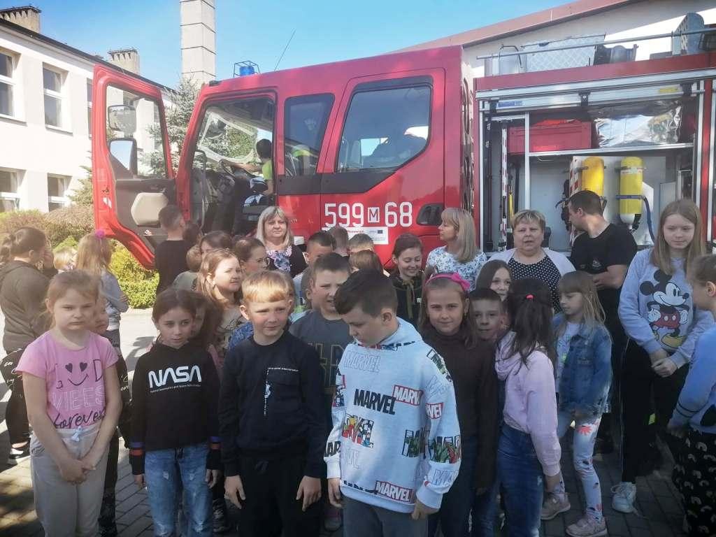 Na zakończenie spotkania uczniowie mieli możliwość poznania wyposażenia strażackiego wozu bojowego i sprzętu ratowniczo – gaśniczego. Strażacy cierpliwie objaśniali, do czego służą elementy wyposażenia, a uczniowie z wielkim zainteresowaniem słuchali i zadawali mnóstwo pytań dotyczących pracy strażaka.