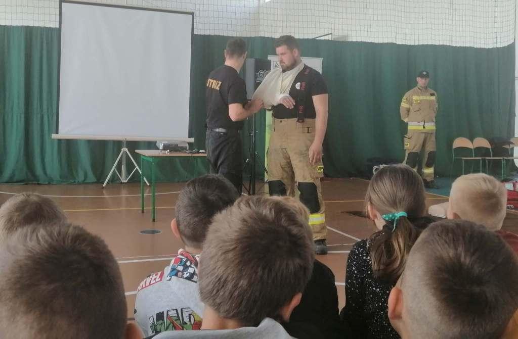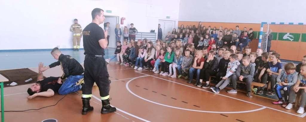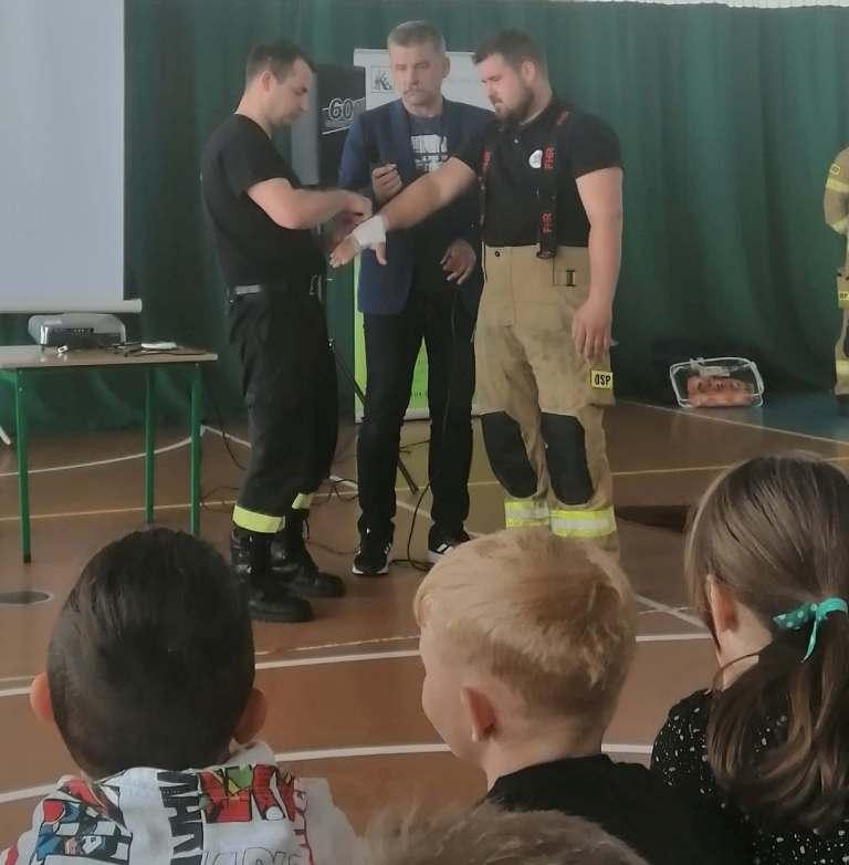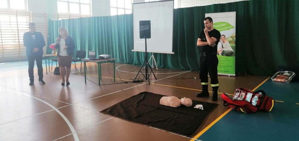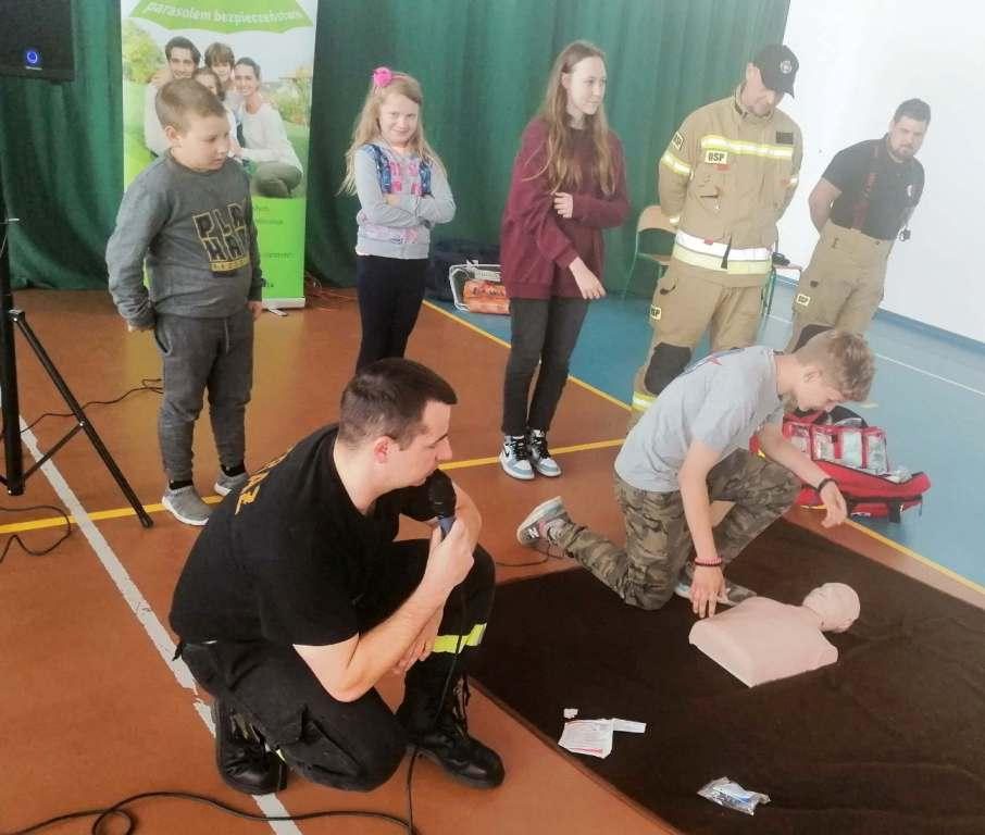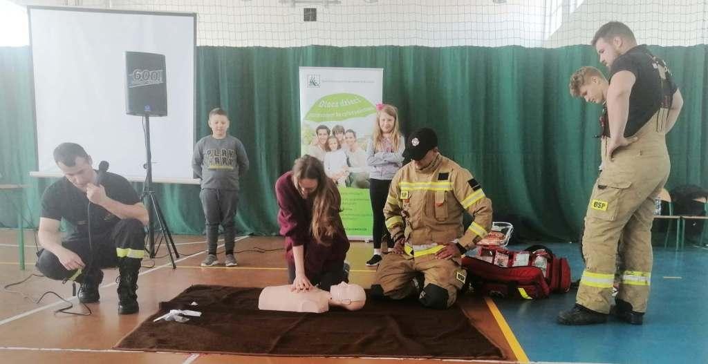 W spotkaniu uczestniczyli również strażacy z OSP w Krzynowłodze Małej: panowie Przemysław Krupa, Grzegorz Glina i Jakub Jędrzejczyk oraz pan Łukasz Ciech z Komendy Powiatowej Państwowej Straży Pożarnej w Przasnyszu. Panowie bardzo fachowo przybliżyli uczniom zasady udzielania pierwszej pomocy przedmedycznej. Oprócz części teoretycznej uczniowie mieli możliwość ćwiczeń resuscytacji krążeniowo-oddechowej na fantomach oraz pozycji bocznej bezpiecznej. Takie praktyczne zajęcia są bardzo cenne, gdyż umiejętność właściwego zachowania się w różnych sytuacjach zagrożenia powinien posiadać każdy bez względu na wiek. Dzięki takiej wiedzy możemy w przyszłości uratować nie jedno życie.