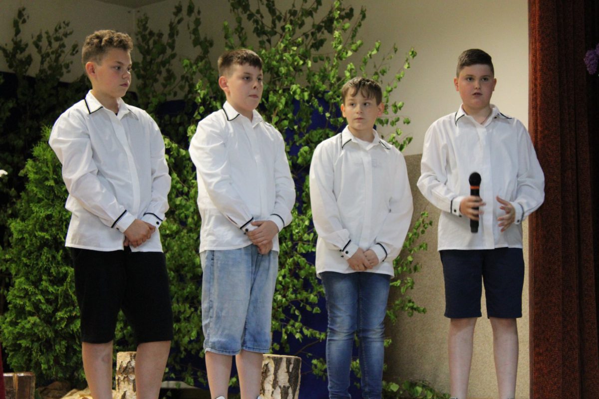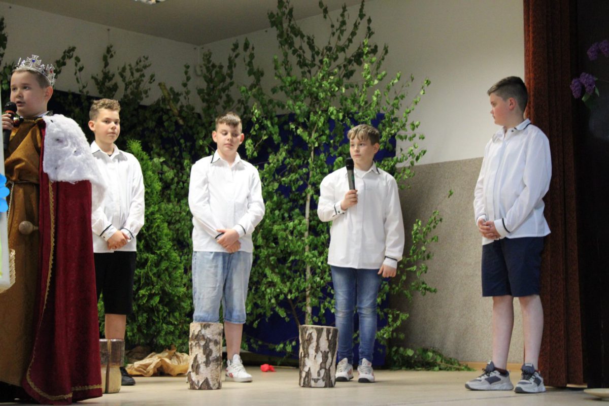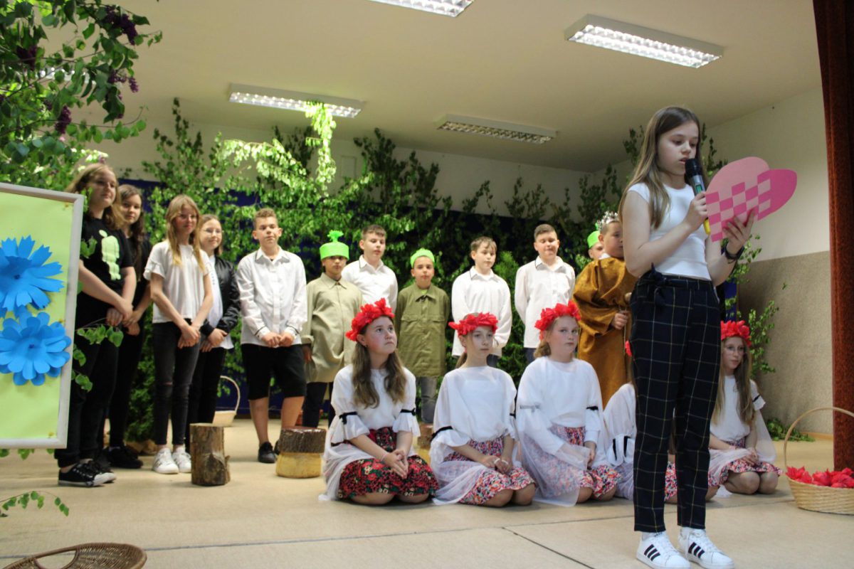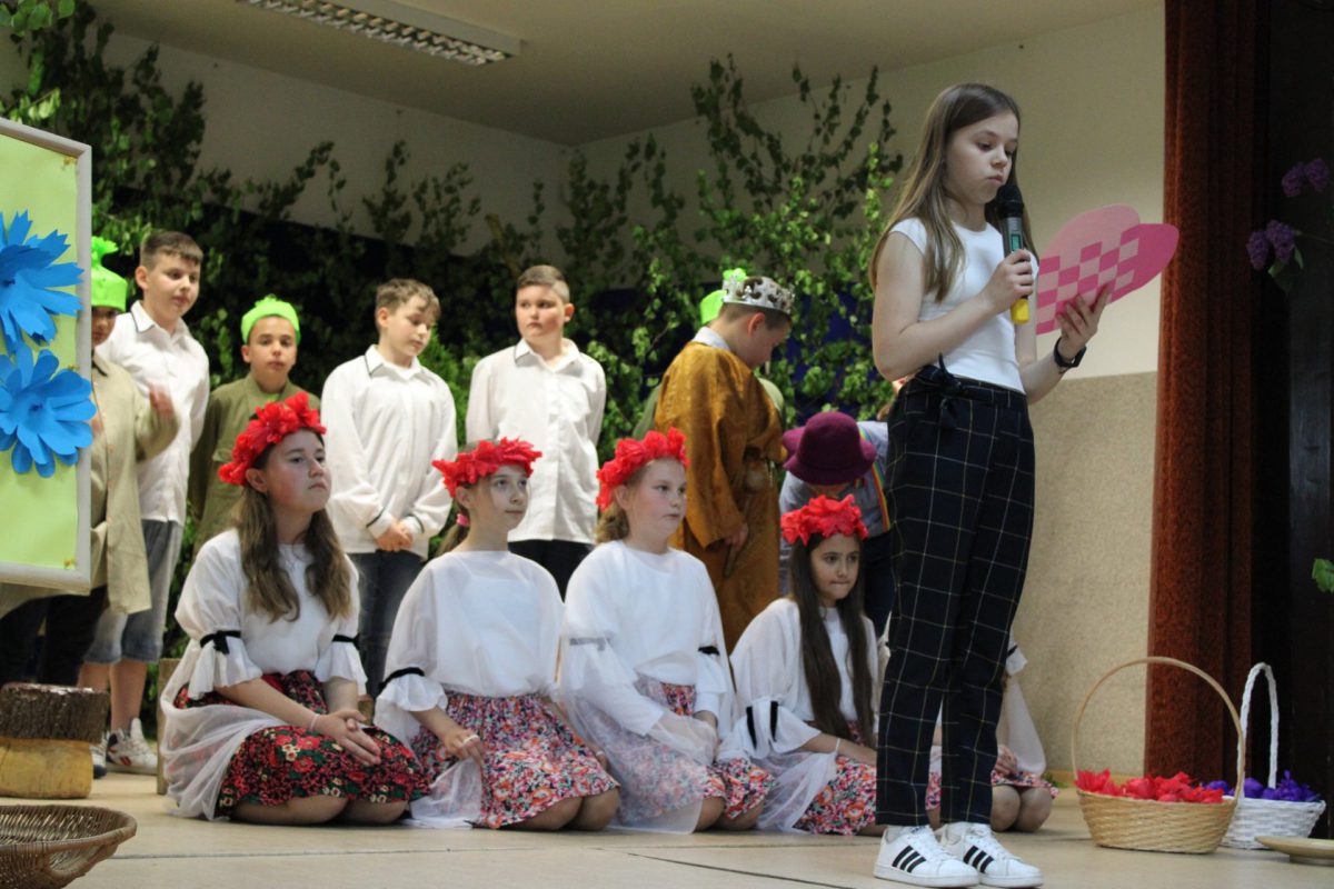 Po powitaniu gości wystąpił Klub seniora a następnie uczniowie klas IV i V zaprezentowali przedstawienie pt. „Na jagody”. Dopełnieniem występów były piosenki, taniec i życzenia. Publiczność była zachwycona popisami dzieci, na twarzach mam malowało się wzruszenie, radość oraz duma ze swoich pociech.