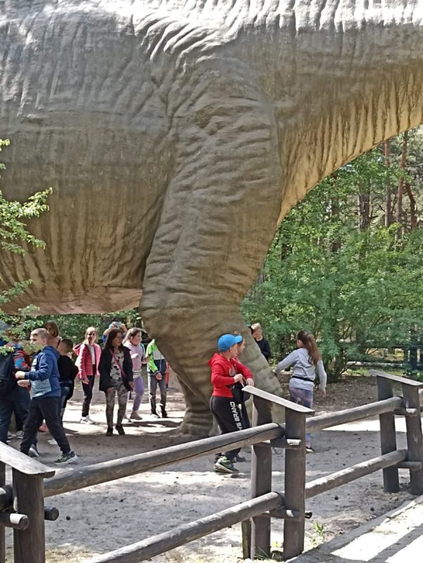 Zwiedzanie uczniowie naszej szkoły zaczęli od ścieżki dydaktycznej. Wędrując przez kolejne ery dziejów Ziemi uczniowie spotkali nie tylko doskonale odwzorowane figury dinozaurów, ale także innych prehistorycznych gadów. Miniony świat ożywał dzięki opowieściom przewodnika, a ustawione wzdłuż ścieżki tablice świetnie je uzupełniały.