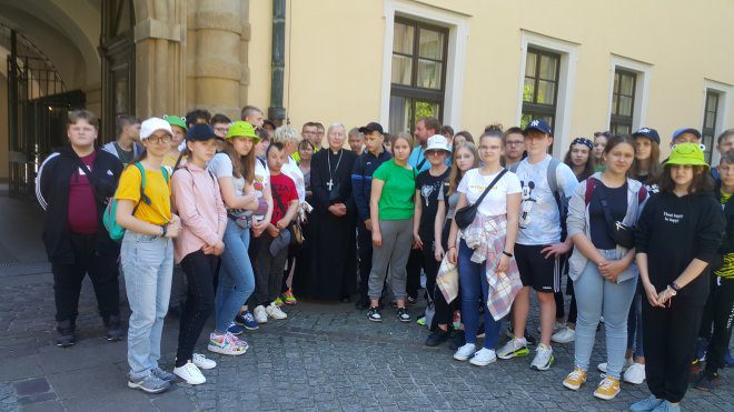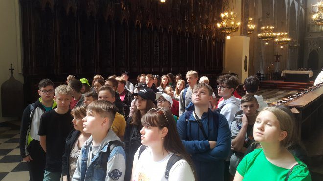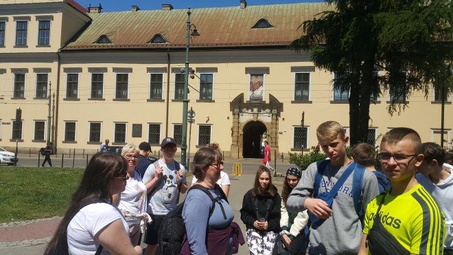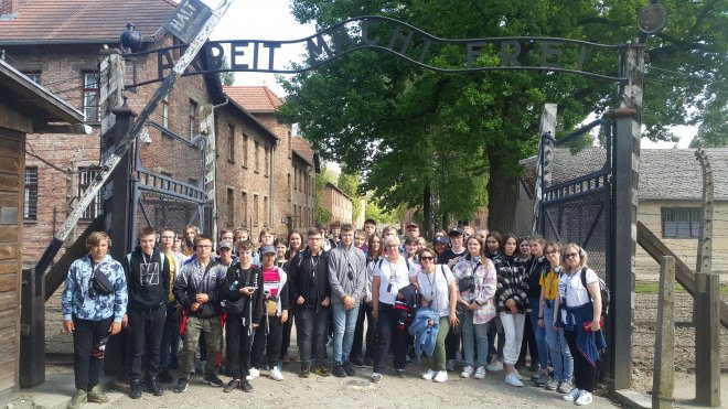 Pierwszym punktem programu był niemiecki obóz koncentracyjny w Oświęcimiu. Przeszliśmy przez słynną bramę z napisem „Arbeit macht frei” czyli „Praca czyni wolnym”. Otrzymaliśmy słuchawki, dzięki którym mogliśmy lepiej słyszeć przewodnika. Zwiedzaliśmy muzeum w ciszy i skupieniu. Na początku udaliśmy się na plac, gdzie więźniowie mieli apele trwające nawet do kilkunastu godzin. Poszliśmy również do budynku, w którym na ścianach wisiały fotografie więźniów oraz obrazy przedstawiające życie w obozie. Obejrzeliśmy również rzeczy osobiste pozostałe po więźniach, takie jak: buty, łyżki, okulary, talerze, walizki, ubrania itp. Przechodząc do kolejnych budynków widzieliśmy płot elektryczny, który otaczał Auschwitz. Pokazano nam również pomieszczenie, w którym były spalane zwłoki, „celę głodową”, „ciemnicę”, pomieszczenie, gdzie gazowano ludzi oraz „ścianę śmierci”. Poznaliśmy trudne warunki, w jakich żyli więźniowie. Udaliśmy się również do Brzezinki – obozu oddalonego o kilka kilometrów od Oświęcimia, tam też wysłuchaliśmy historię zagłady. Zapamiętamy na długo tę lekcję historii i miejsca, gdzie „ludzie ludziom zgotowali ten los”.