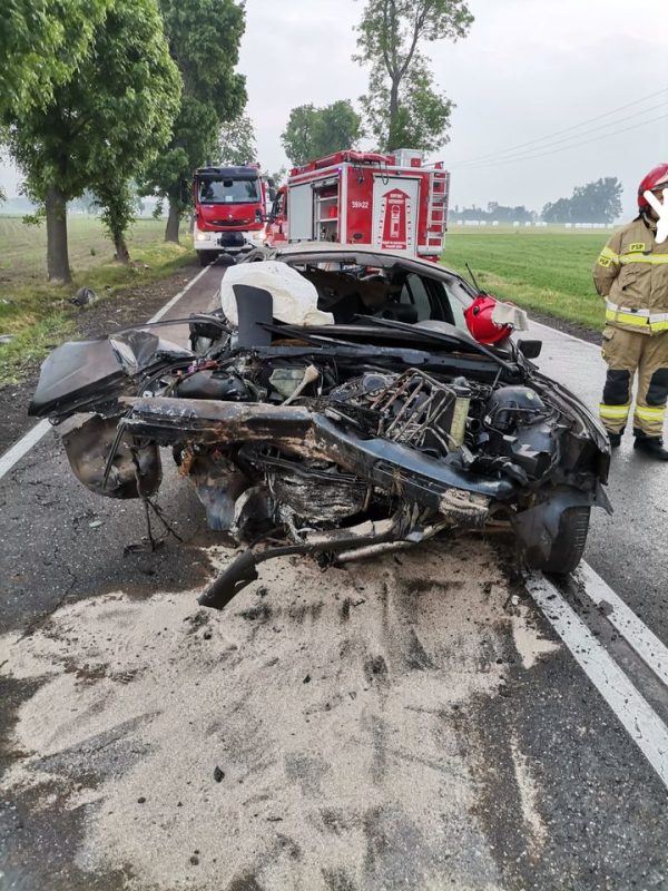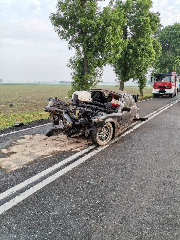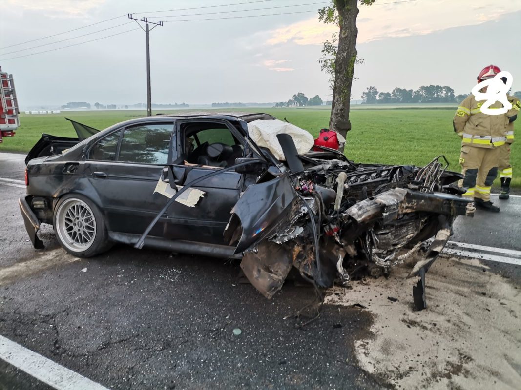 Samochodem osobowym marki BMW podróżowały 4 osoby. Auto zjechało z drogi i uderzyło w przydroże drzewo. Przybyłe na miejsce zdarzenia zastępy straży pożarnej udzieliły kwalifikowanej pomocy przedmedycznej poszkodowanym osobom. Dodatkowo strażacy zabezpieczyli miejsce zdarzenie i odłączyli instalację elektryczna pojazdu. W działaniach brały udział 3 zastępy: 2 KP PSP i 1 OSP Mchówko.