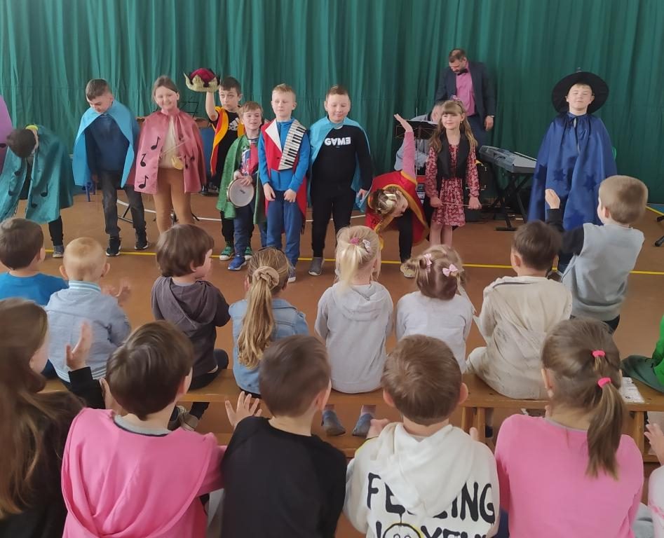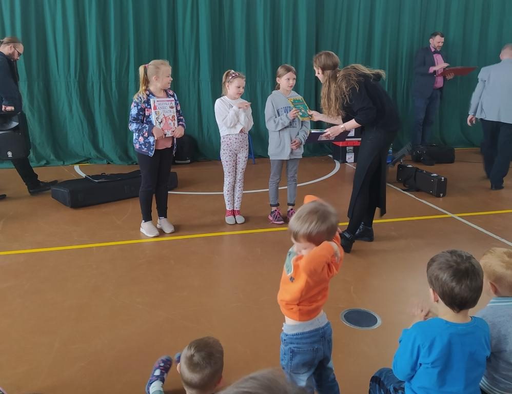 Słuchając poszczególnych utworów, dzieci dowiedziały się, kim jest kompozytor i jak ważny jest dyrygent, by zsynchronizować grę instrumentów podczas wspólnego wykonywania utworu. Spotkanie zakończył konkurs wiedzy muzycznej, który wygrała Oliwia Pejs z klasy IIIa. Gratulujemy!