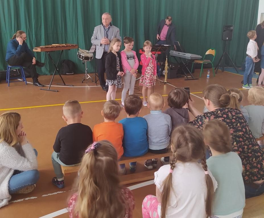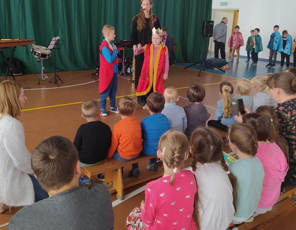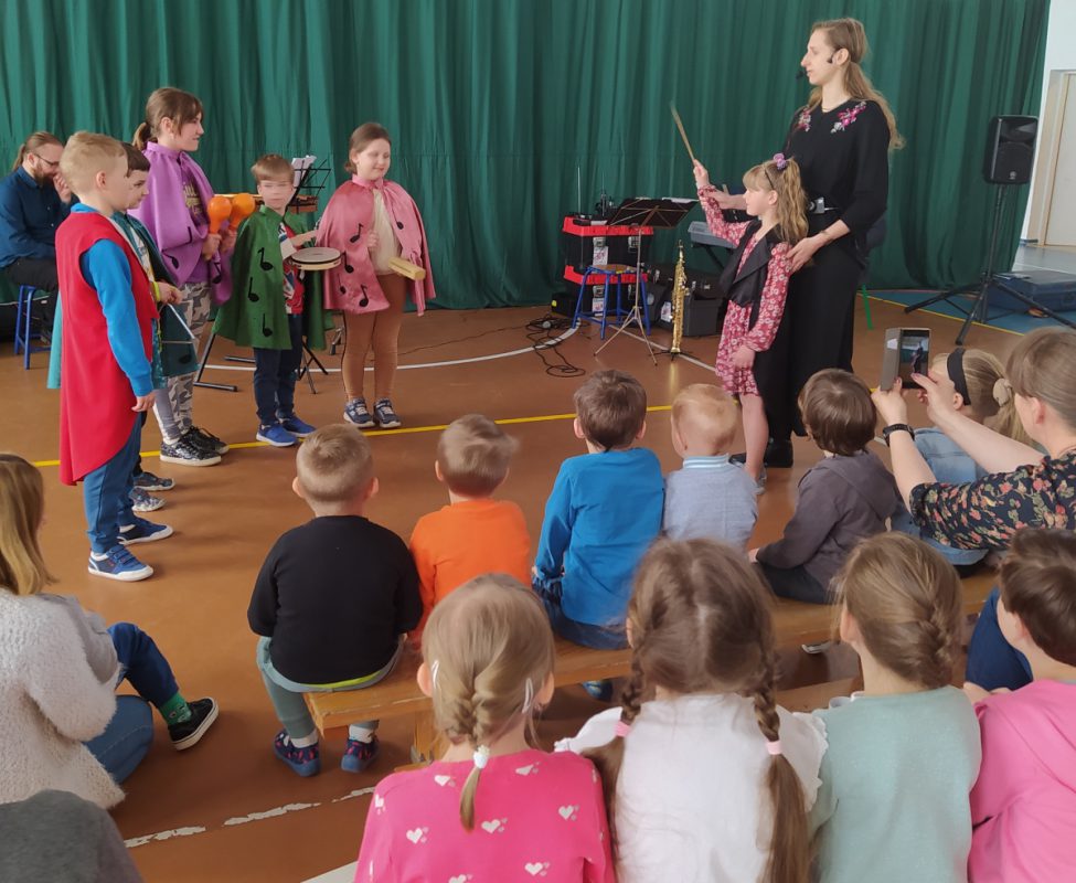 Następnie artyści z Agencji Artystycznej „MAT” z Olsztyna przeszli do części głównej naszego spotkania, a były to instrumenty perkusyjne. Dzieci poznały dźwięk werbla, trójkąta, tamburyna, drewnianego bębenka oraz ksylofonu. Towarzyszył im saksofon sopranowy, który zaliczamy do instrumentów dętych drewnianych. Dzieci wysłuchały utworów klasycznych i jazzowych zaprezentowanych przez przybyłych muzyków.