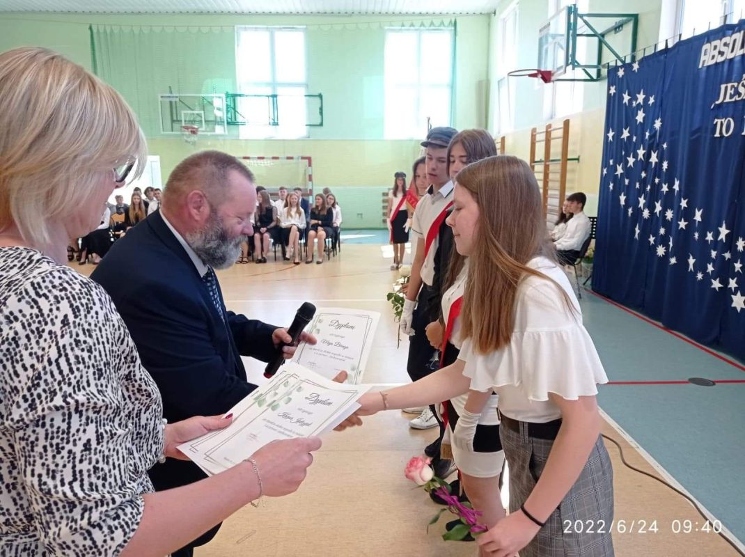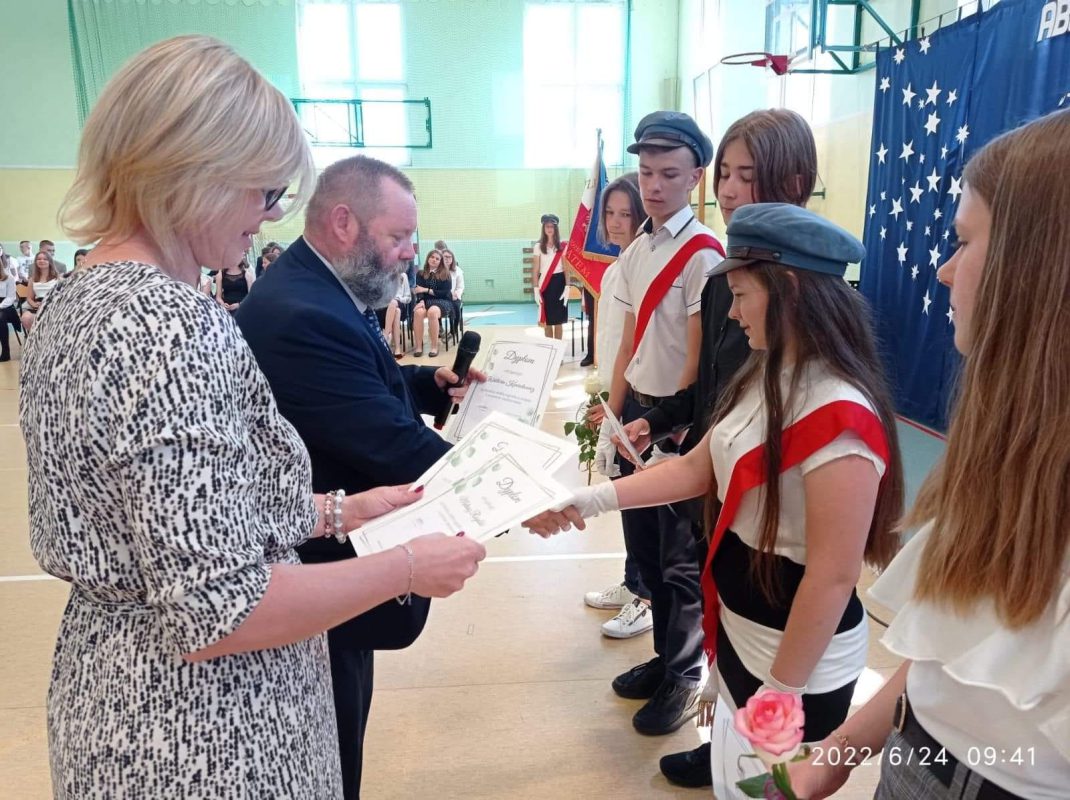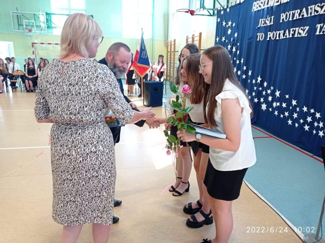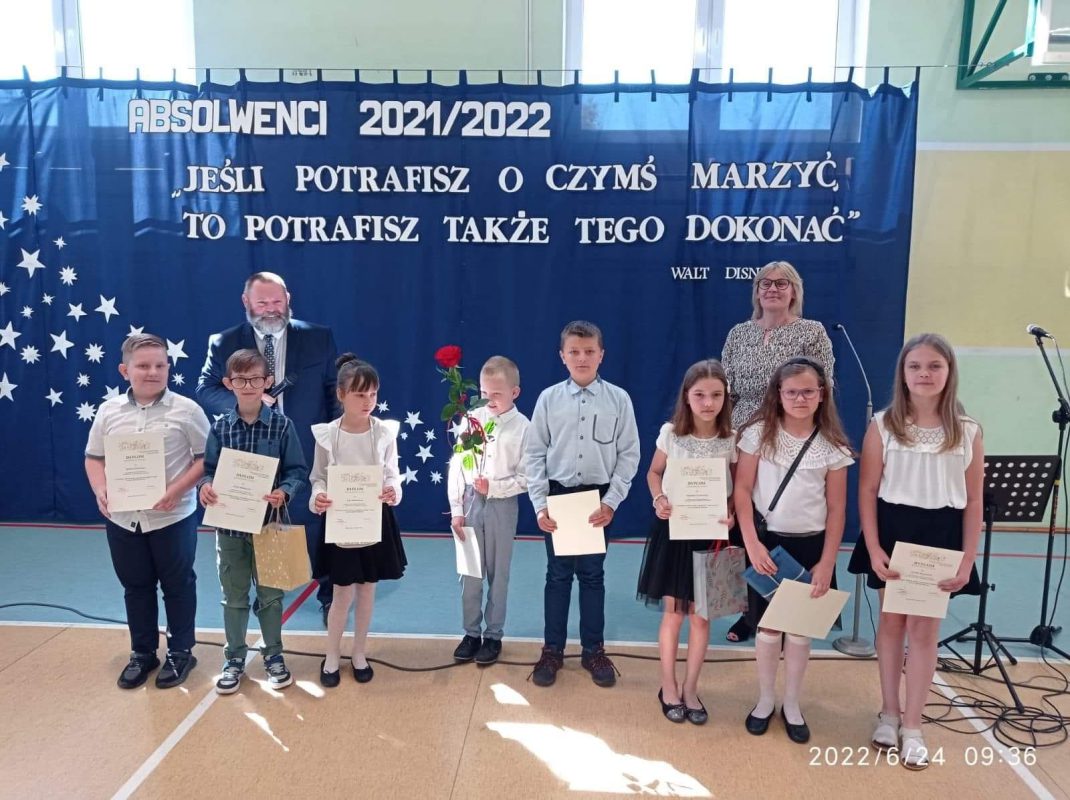 Mijający rok szkolny był rokiem niełatwym, naznaczonym pandemią, nauczaniem zdalnym i hybrydowym, kwarantannami oraz wybuchem wojny w Ukrainie. Pomimo tego wszyscy uczniowie uzyskali promocję oraz wszyscy uczniowie klas 8 ukończyli szkołę podstawową. W czasie uroczystości wyróżnieni uczniowie otrzymali świadectwa z rąk Dyrektora, Pana Piotra Sekuny i Przewodniczącej Rady Rodziców, Pani Aleksandry Biragi. Zostały również wręczone nagrody za osiągnięcia sportowe, przedmiotowe oraz za działaność w Radzie Samorządu Uczniowskiego.
