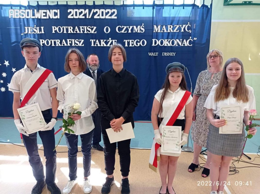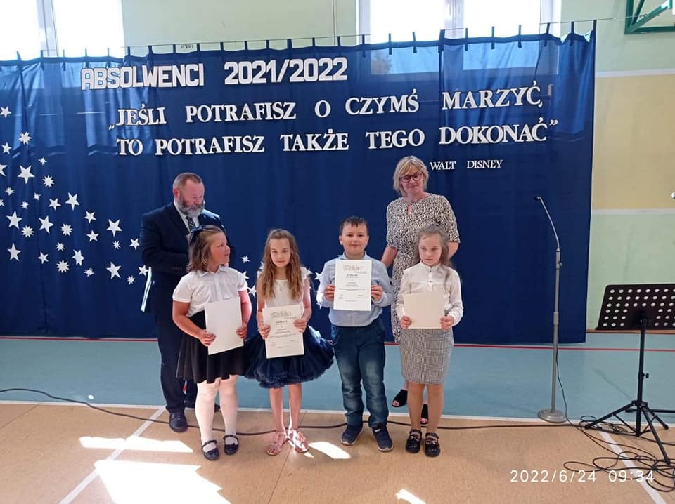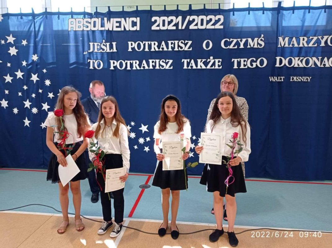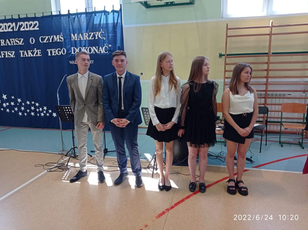 Mijający rok szkolny był rokiem niełatwym, naznaczonym pandemią, nauczaniem zdalnym i hybrydowym, kwarantannami oraz wybuchem wojny w Ukrainie. Pomimo tego wszyscy uczniowie uzyskali promocję oraz wszyscy uczniowie klas 8 ukończyli szkołę podstawową. W czasie uroczystości wyróżnieni uczniowie otrzymali świadectwa z rąk Dyrektora, Pana Piotra Sekuny i Przewodniczącej Rady Rodziców, Pani Aleksandry Biragi. Zostały również wręczone nagrody za osiągnięcia sportowe, przedmiotowe oraz za działaność w Radzie Samorządu Uczniowskiego.