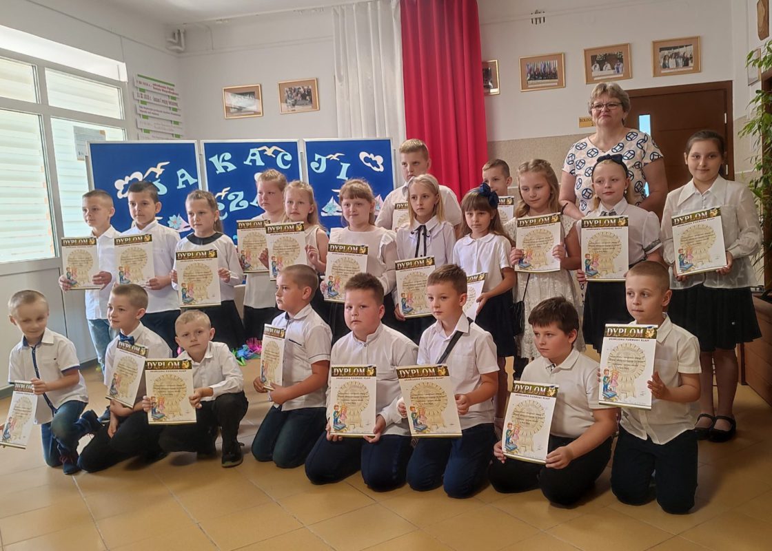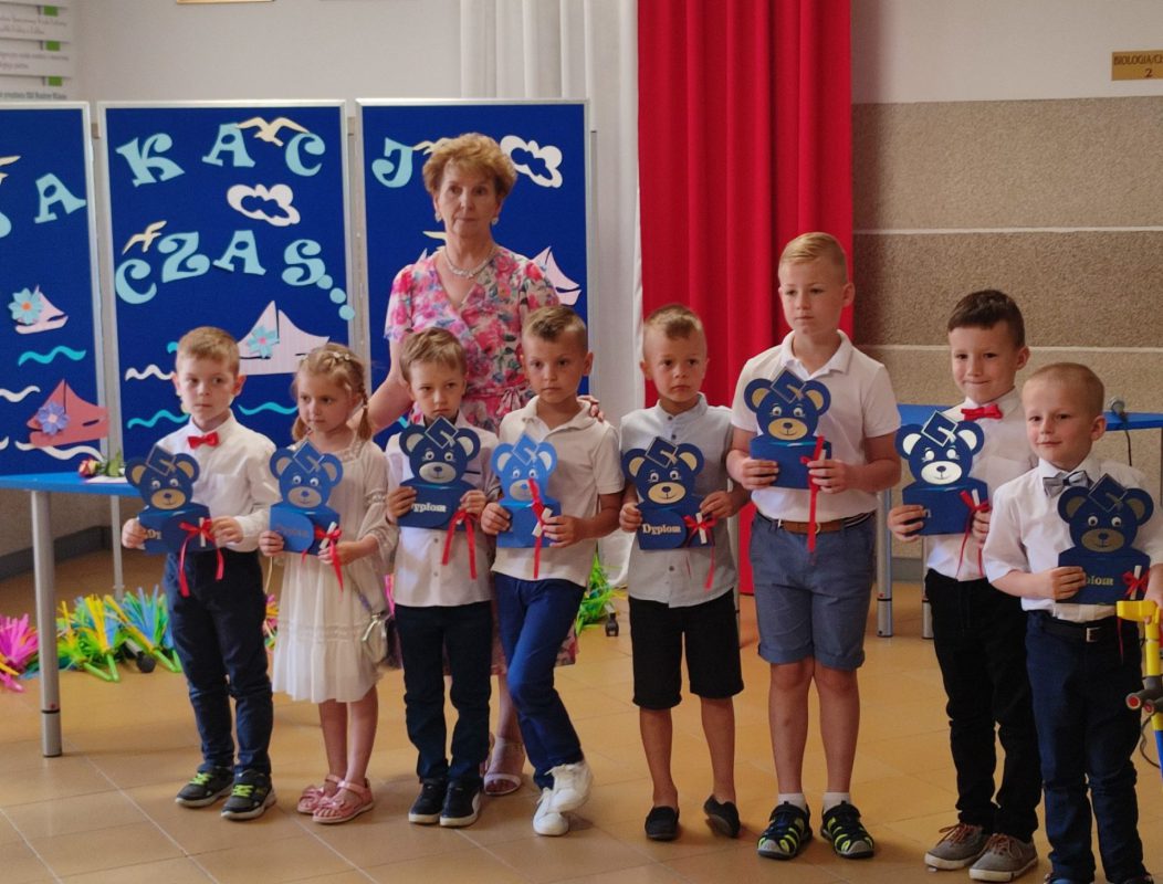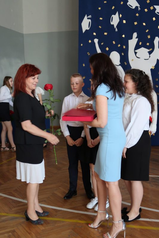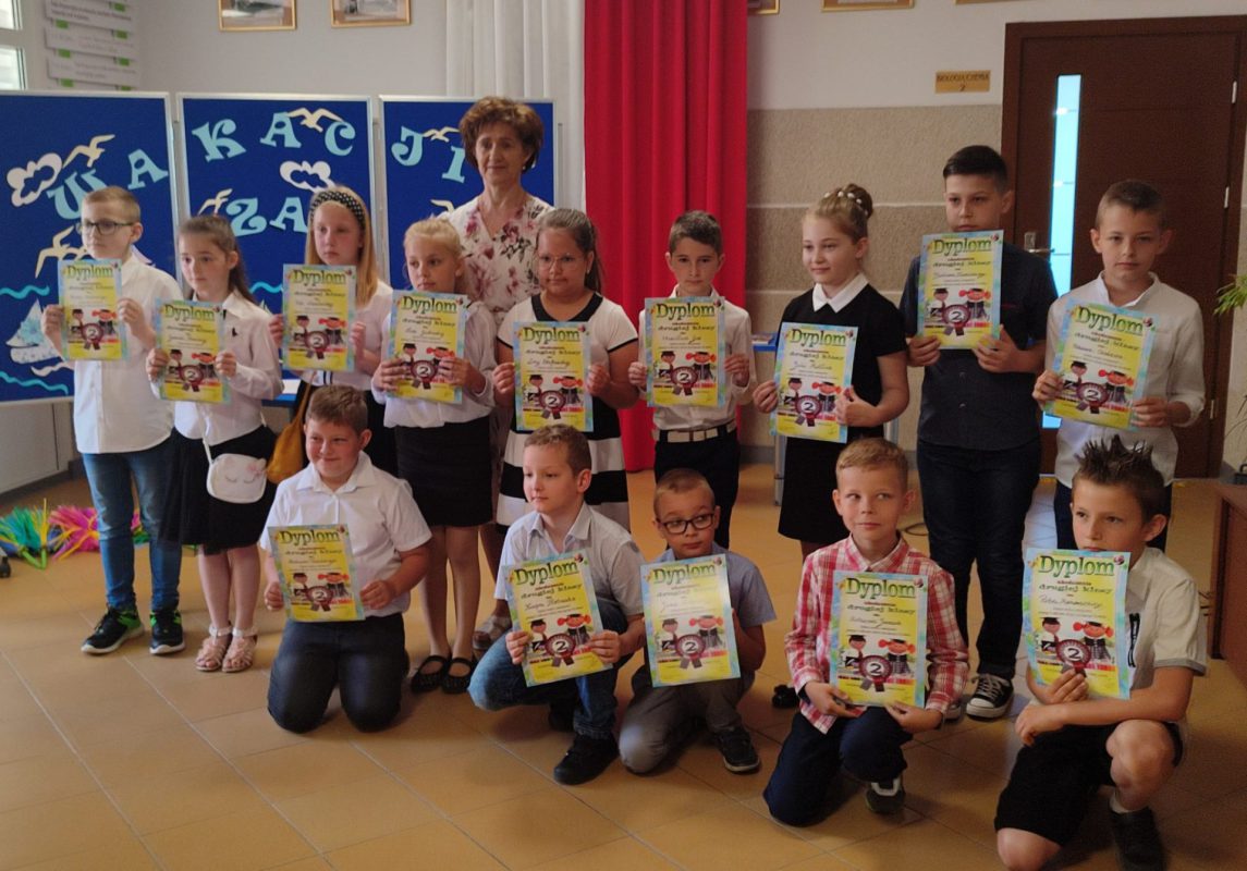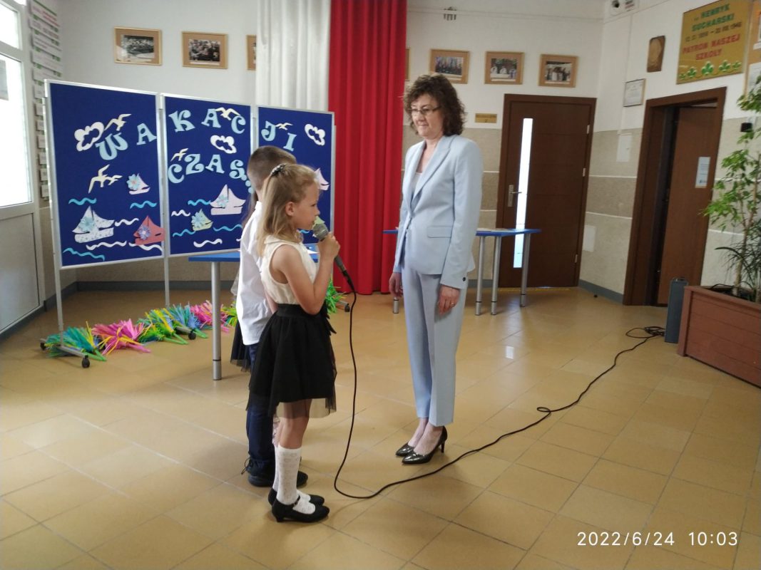 Pani wicedyrektor Iwona Tworkowska przewodniczyła zakończeniu roku szkolnego dla najmłodszych uczniów klas I-III oraz oddziałów przedszkolnych. Klasa I zaprezentowała swoje umiejętności taneczne do znanej i lubianej piosenki „Chocolate”, natomiast uczniowie z klasy III zabrali wszystkich kolegów i koleżanki, rodziców oraz nauczycieli w magiczną podróż „Lokomotywą” Juliana Tuwima. W finale zaprezentowano energiczny taniec z pomponami do piosenki „Holidays”. Występy uczniów wywołały wiele wspaniałych odczuć w odbiorcach, od radości, po łzy wzruszenia , wprowadziły wszystkich zgromadzonych w iście wakacyjny nastrój.