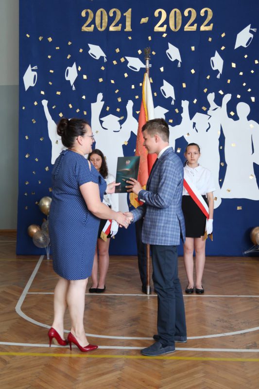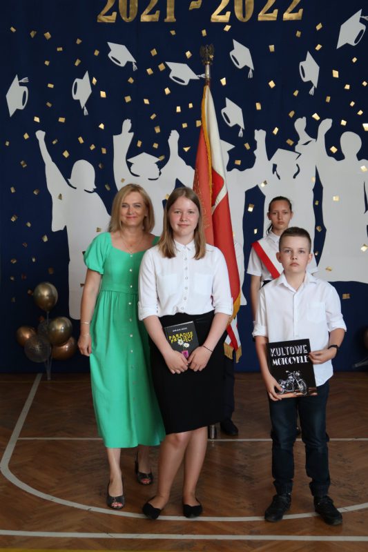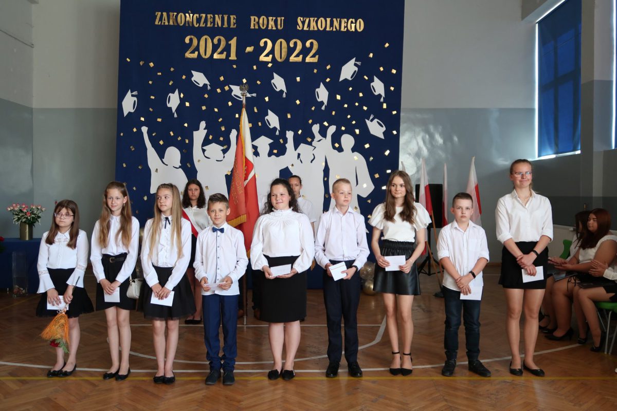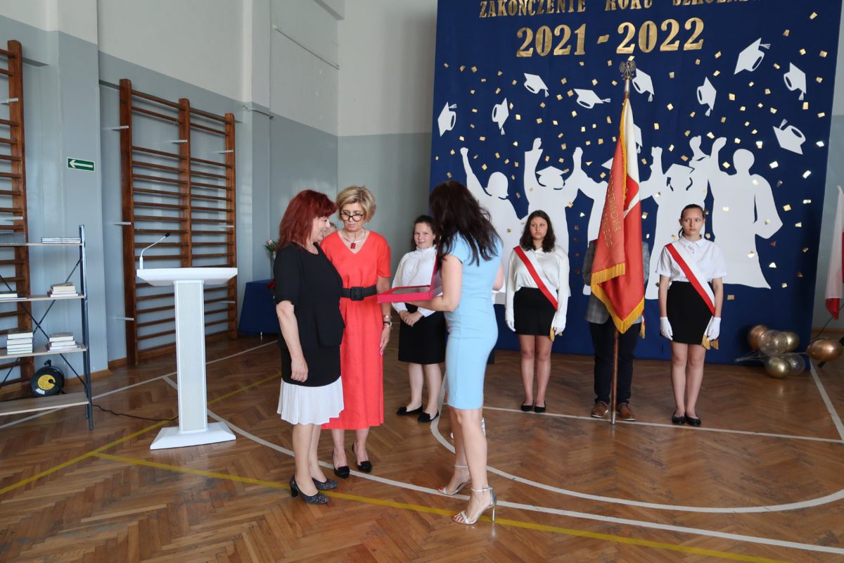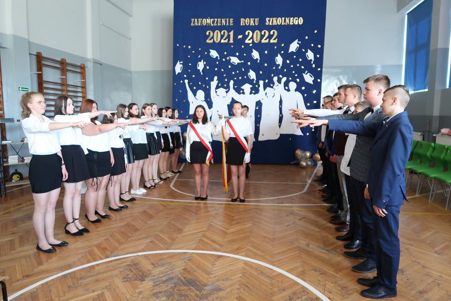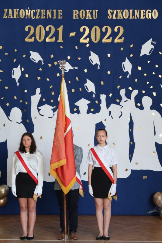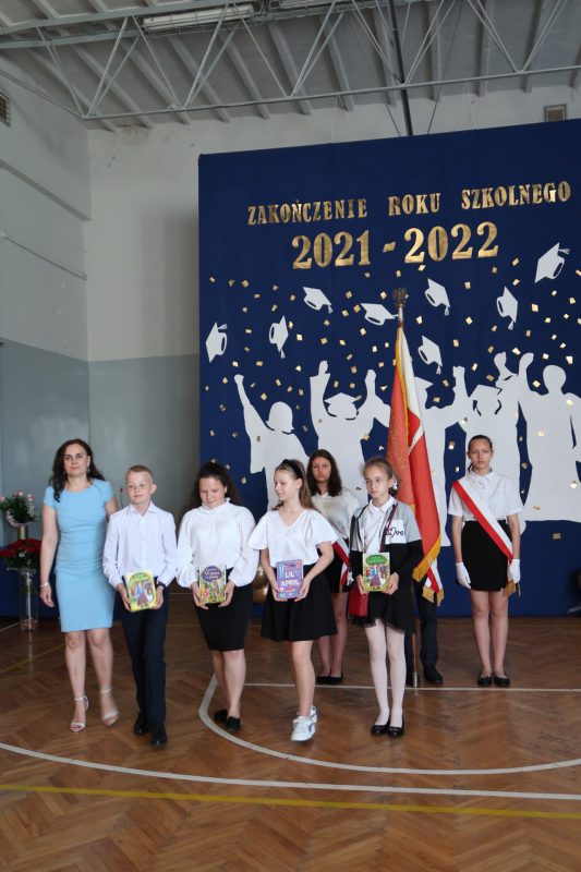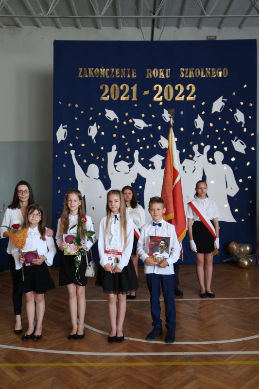 Akademia zakończenia roku w grupie starszych klas rozpoczęła się odtańczeniem poloneza w wykonaniu absolwentów szkoły oraz ich wychowawcy. Następnie wprowadzono Sztandar Szkoły i odśpiewano hymn państwowy. Uczniowie odebrali świadectwa z wyróżnieniem, nagrody książkowe i rzeczowe za wzorowe zachowanie, bardzo dobre wyniki w nauce oraz za osiągnięcia sportowe, udział w konkursach i działalność w organizacjach uczniowskich. Wręczono także stypendia naukowe i nagrodę dla „Absolwenta Szkoły Podstawowej”. Absolwentem Szkoły Podstawowej im. mjr. Henryka Sucharskiego w Nowej Krępie, rocznik 2021/2022 została uczennica klasy VIII Natalia Grabowska. Pani dyrektor Joanna Glinka złożyła na ręce rodziców listy gratulacyjne oraz podziękowania za pomoc w działaniach szkoły i wspomaganie w realizacji zadań wychowawczych. Szczególne słowa uznania skierowano do pani wójt Grażyny Wróblewskiej, której nadano tytuł „Przyjaciela Szkoły”.
