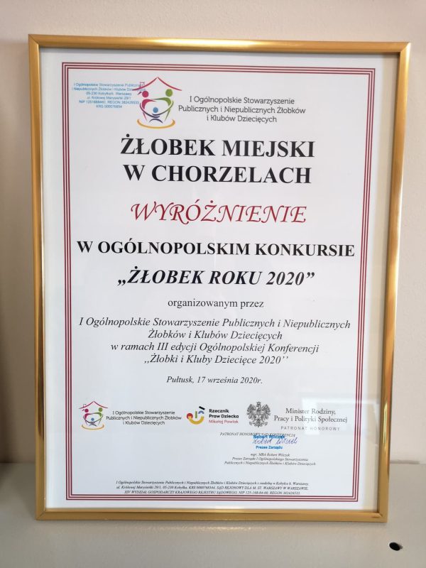 Żłobek Miejski i Klub Dziecięcy w Chorzelach w czwartek, 17 września po raz kolejny na uroczystej gali w Pułtusku otrzymały wyróżnienie w ogólnopolskim konkursie „Żłobek Roku i Klub Dziecięcy Roku 2020”.