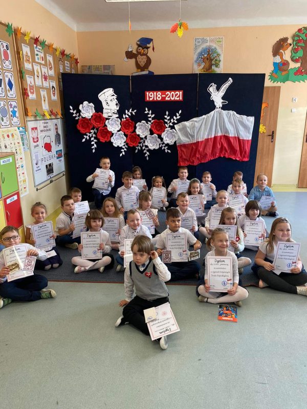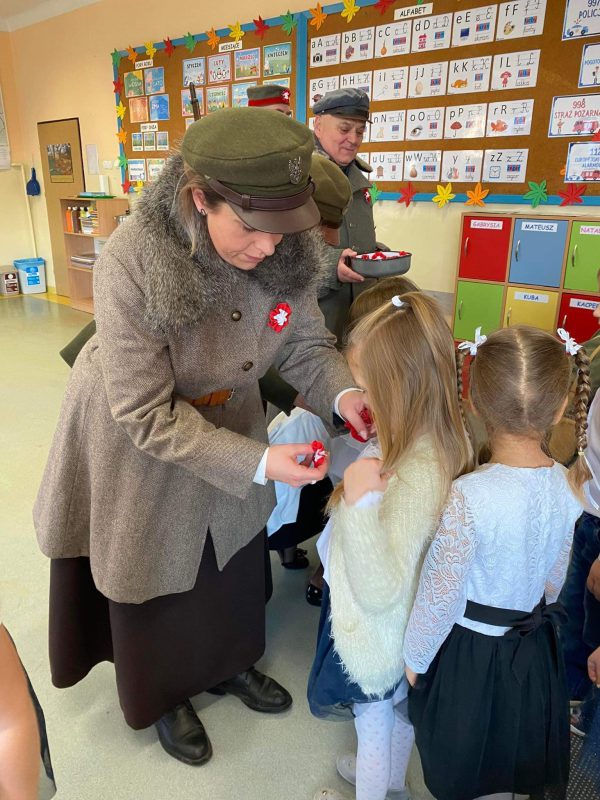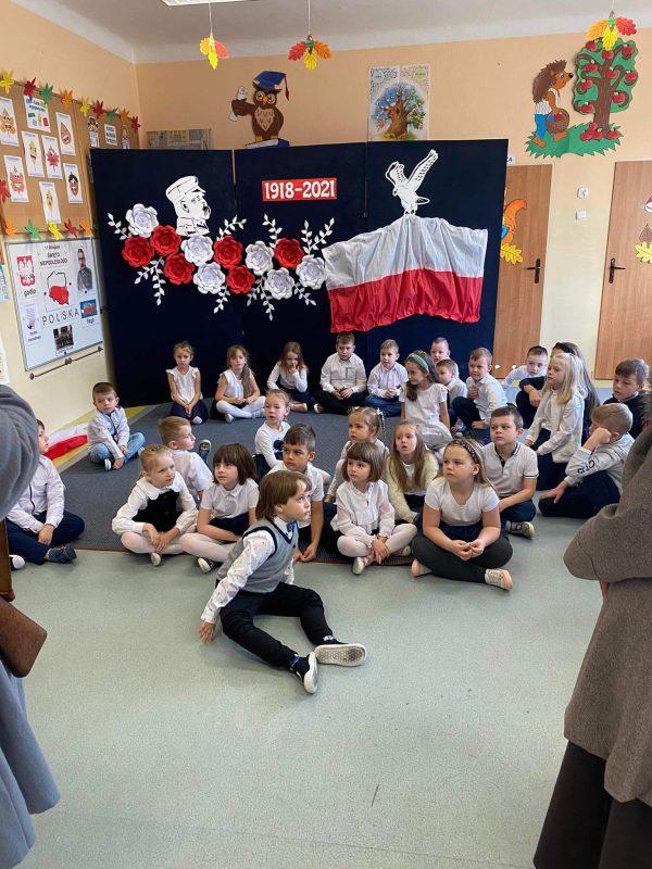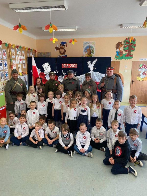 Rekonstruktorzy przybliżyli dzieciom historię odzyskania niepodległości przez Polskę, zaprezentowali swoje historyczne mundury z okresu walk o niepodległość, pokazali podręczne wyposażenie oraz udekorowali ubrania przedszkolaków kokardami narodowymi. Dzieci miały okazję opieczętować kartki okolicznościowe wydawane w latach 30-tych XX w. Następnie wspólnie z rekonstruktorami z dumą odśpiewały hymn narodowy. Na zakończenie spotkania wszystkie dzieci otrzymały patriotyczne dyplomy. Dla wszystkich przedszkolaków było to bardzo ciekawe i emocjonujące wydarzenie. Dziękujemy zaproszonym gościom za wspaniałą lekcję historii!!!